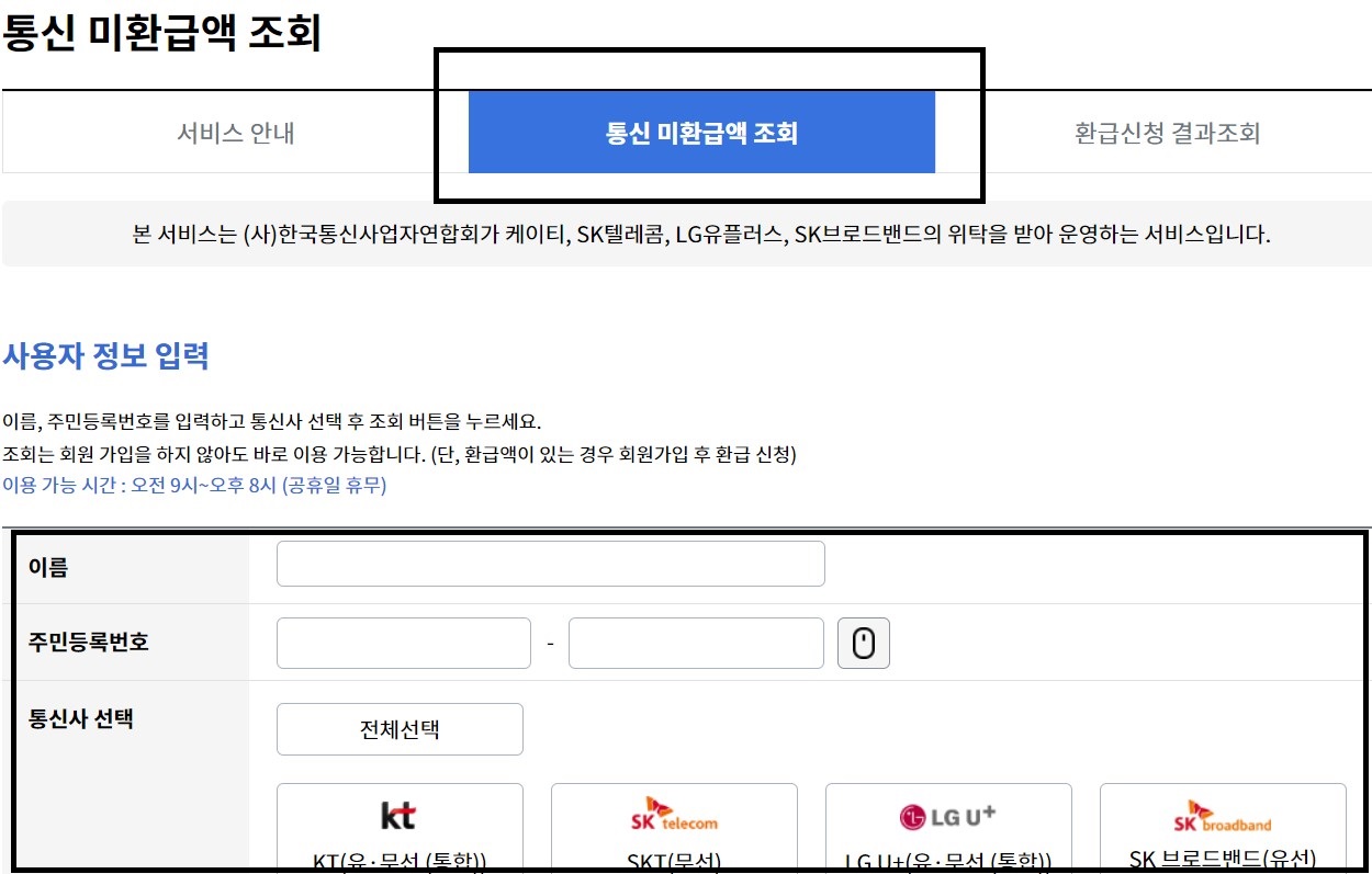 4. 통신 미환급액 조회를 바로 해볼껀데요. 먼저 사용자 정보입력을 해야 되요. 사용자 정보는 이름, 주민등록번호, 나의 통신사를 설정하시면 됩니다. 통신사는 KT, SK 브로드밴드, LG 유플러스, SKT 중 설정을 하시면됩니다.