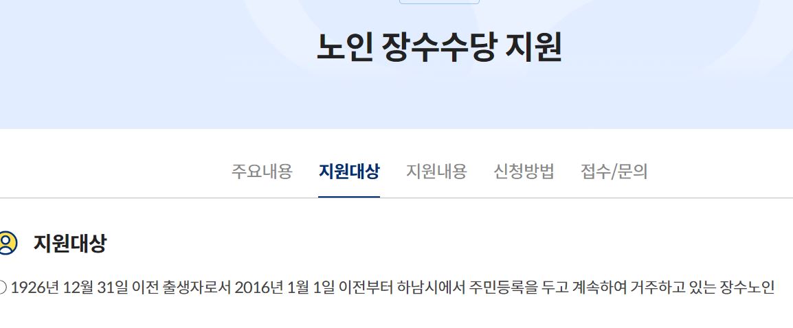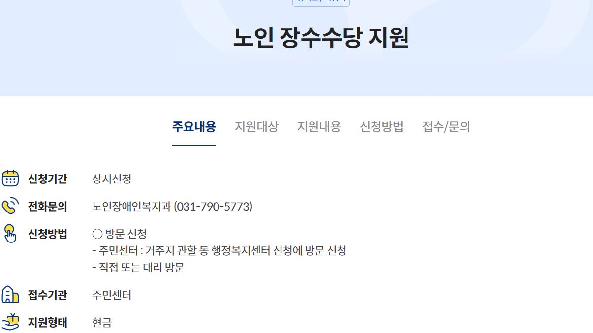 장수수당의 나이는 거주하고 있는 관할지역의 80세 이상의 노인분들께서 수당을 받으실수 있다고 하는데요. 나이에 해당이 된다면 수령이 가능하며 기초연금을 받지 않는 노인분들에게 지급이 된다고 합니다. 단, 해당지역마다 약간씩 차이가 있으니 조건을 무조껀 확인 해보시기 바랍니다. 그럼 아래에서 확인방법을 통해 확인을 하여 볼까요?