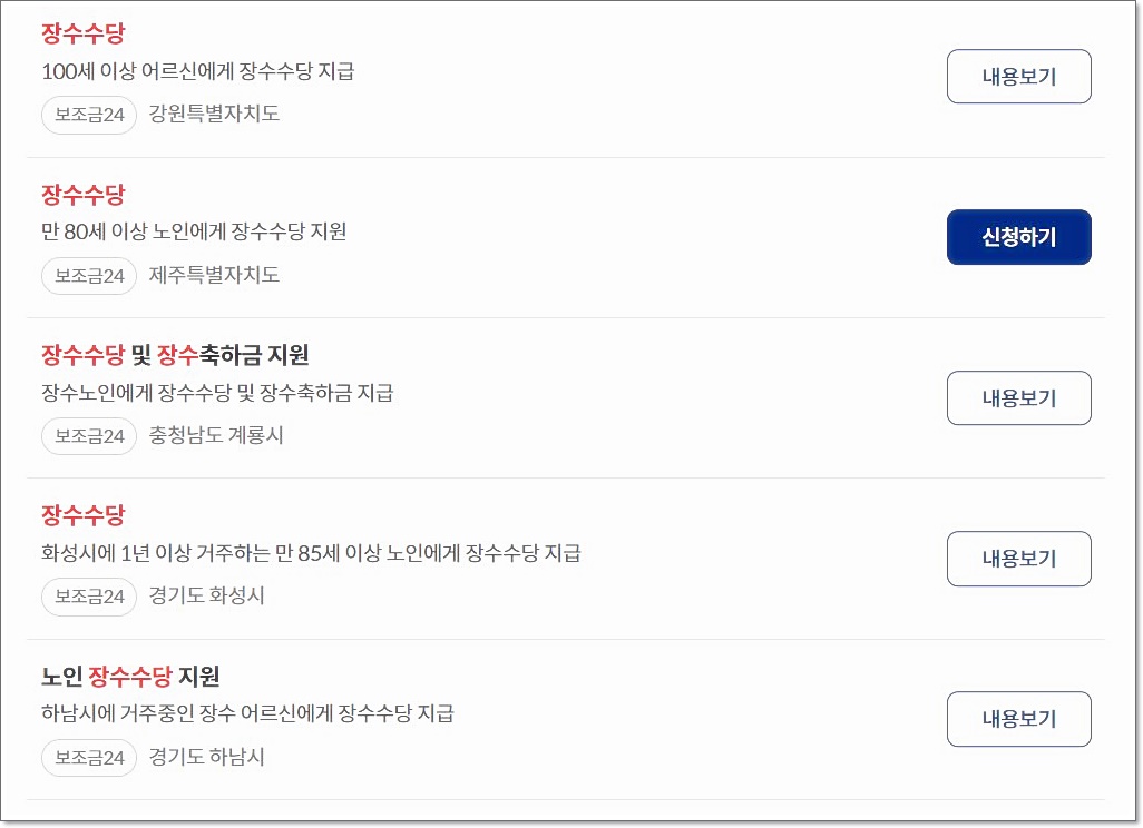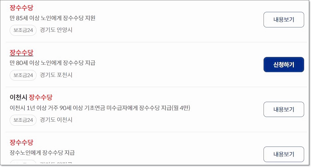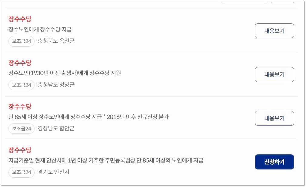 그리고 돋보기를 클릭하여 주신후에 아래를 보시게 되면 장수수당들이 쭈욱 나와 있는 것을 확인하실수 있으신데요. 여러분들이 해당지역을 클릭하여 상세 내용을 확인후 신청방법을 보시고 신청을 하시면 완료가 됩니다. 참 쉽죠?