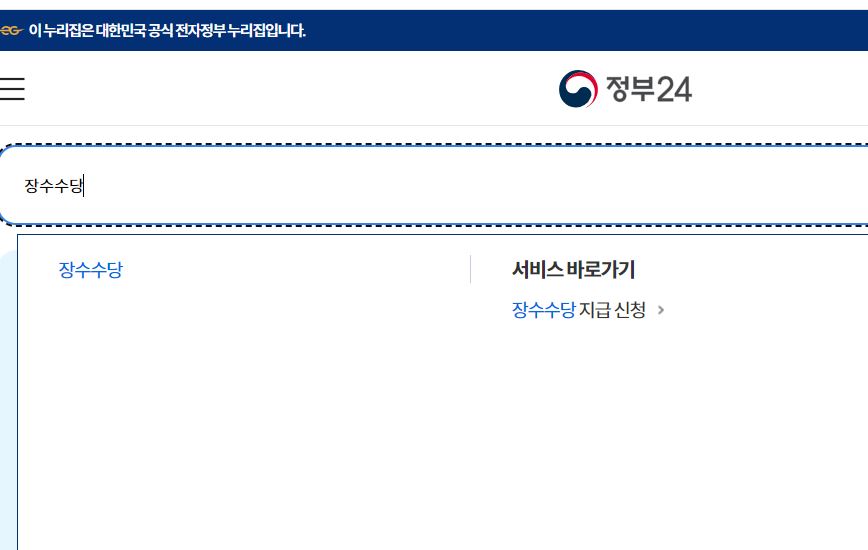 장수수당을 확인하기 위해서는 먼저 정부 24로 들어가 주시기 바랍니다. 이로 들어가시게 되시면 다양한 장수수당들을 알아보실수 있으신데요. 먼저 검색창에 장수수당을 검색어 입력후 돋보기를 클릭하여 주세요.