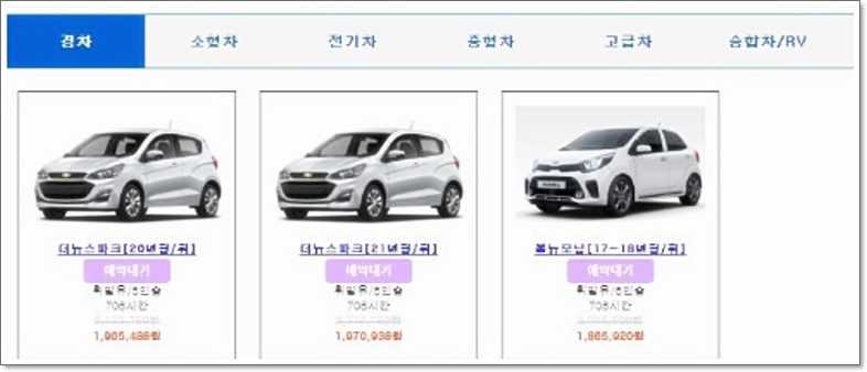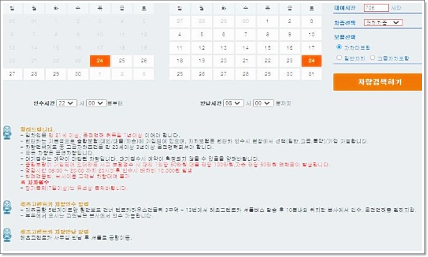 제가 임의로 한 달로 설정해 보았는데, 차종은 경차로 선택했습니다. 여러분께서는 원하시는 차종으로 선택하셔도 좋습니다. 또한, 이용 시간도 선택 가능하니 원하는 대로 설정해 보세요.
