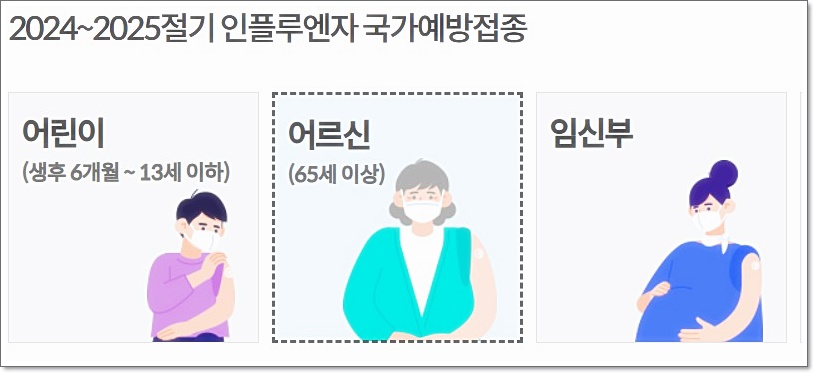 65세 이상 어르신 : 65세 이상 어르신들은 면역력이 떨어지기 때문에 독감에 노출이 될 경우 중증화가 될 확률이 높다고 하는데요. 그렇기에 65세 이상 어르신들은 예방접종을 권장한다고 합니다.