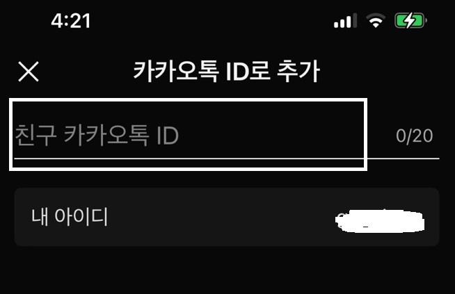 그리고 나면 아래와 같이 친구 카카오톡 ID를 입력하라는 란이 보이실텐데요. 이때 이부분을 클릭하여 주시고 내가 검색하고 싶은 아이디를 입력하시면 친구의 카카오톡 아이디가 뜨실것 입니다. 매우 간단하죠