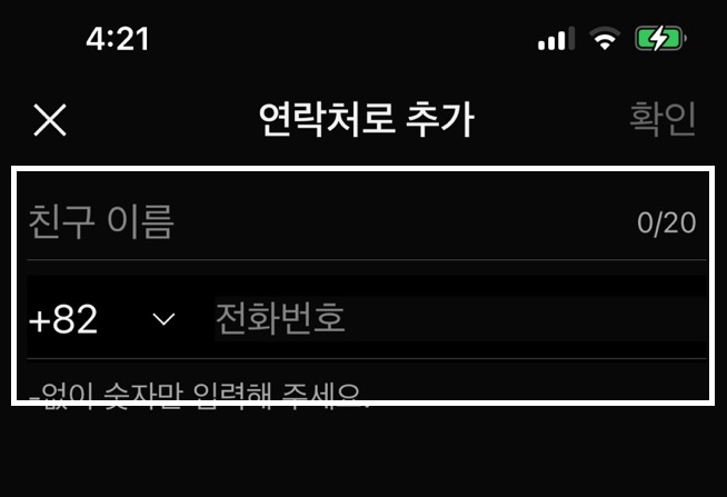 자 클릭하여 주셨으면 위와 같은 화면이 나오게 되실텐데요. 전화번호를 +82옆에 입력하여 주시면됩니다. 이때, - 이부분을 빼시고 그대로 번호만 입력하여 주시고 확인을 누르시면 친구의 카톡이 뜨게 됩니다.