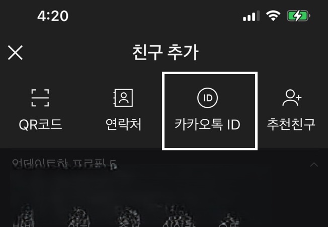 카톡 친구추가하는법 세번째는 카카오톡 ID로 추가 라고 하는데요. 카카오톡 ID로 추가하는것도 매우 간단하게 이용하실수 있습니다. 먼저 카카오톡으로 들어가신후에 위의 사람 플러스 모양을 클릭하여 주세요. 그리고 나면 위의 큐알코드, 연락처, 카카오톡 ID 그리고 추천친구가 보이시죠 이때, 카카오톡 ID부분을 클릭하여 줍니다.
