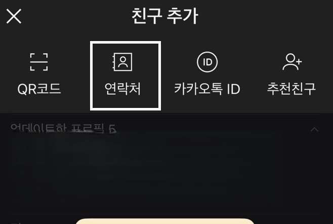 카톡 친구추가하는법 두번째는 전화번호로 추가 라고 하는데요. 전화번호로 추가하는것도 매우 간단하게 이용하실수 있습니다. 먼저 카카오톡으로 들어가신후에 위의 사람 플러스 모양을 클릭하여 주세요. 그리고 나면 위의 큐알코드, 연락처, 카카오톡 ID 그리고 추천친구가 보이시죠 이때, 연락처 부분을 클릭하여 줍니다.
