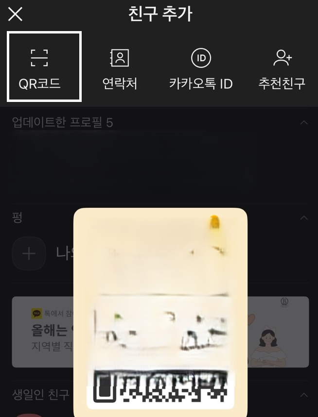카톡 친구추가하는법 첫번째는 큐알코드 스캔방법 이라고 하는데요. 큐알코드 스캔방법은 매우 간단한대요. 먼저 카카오톡을 들어가게 되시면 메인화면 위에 있는 사람 플러스 모양을 클릭하여 주세요. 그렇기에 되시면 바로 큐알코드를 스캔하실수 있게 나오니 여러분들이 추가하실 분들의 큐알코드를 가져다 대시고 바로 친구추가 해보시기 바랍니다. 아래 다양하게 큐알코드 스캔방법 참고하여 보세요.