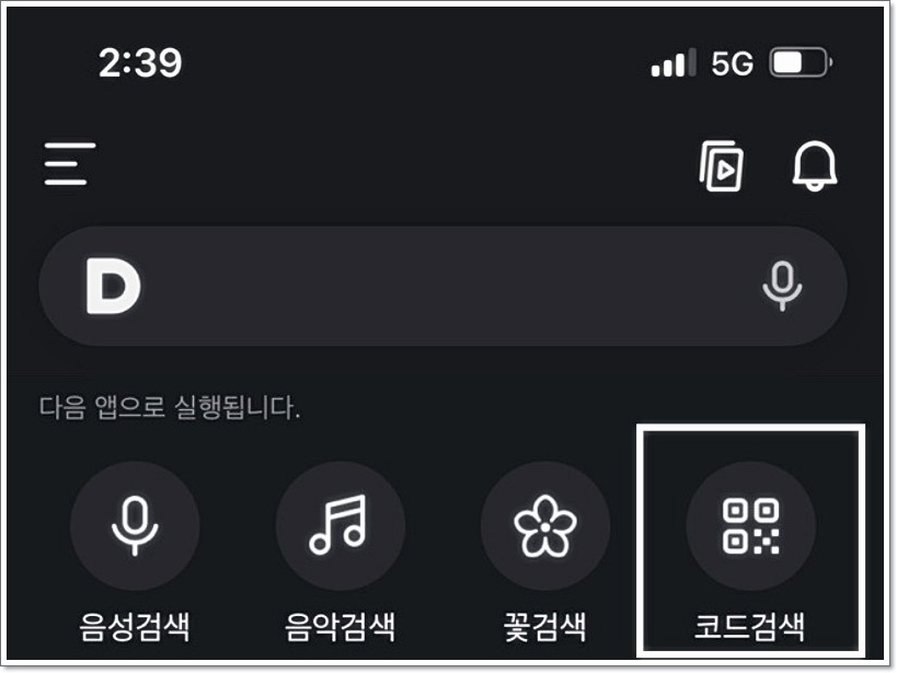 마이크 모양을 클릭하셨다면, 아래와 같은 화면이 나타납니다. 이때, 화면 맨 끝에 '코드 검색'이라는 옵션이 보이실 겁니다. 이 부분을 클릭한 후, QR 코드를 스캔하시면 됩니다. 매우 간단하죠?