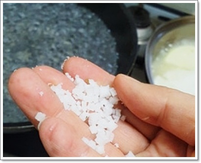 이제 물에 소금을 넣어주세요. 소금을 넣는 이유는 두릅의 영양소가 파괴되는 것을 방지하고, 색을 선명하게 유지하기 위해서입니다. 한 숟가락 정도의 소금을 넣어주시고, 데칠 때는 십자가 모양을 낸 앞부분부터 넣어주세요.