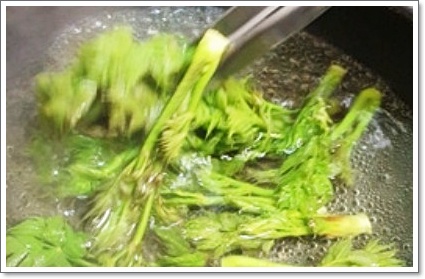 이는 앞부분이 두꺼워서 더 오래 데쳐지기 때문에, 먼저 넣어주면 골고루 익을 수 있습니다. 두릅을 데칠 때는 1분을 넘기지 않도록 주의하시고, 위와 같이 두릅이 살짝 구부러질 정도로 데쳐지면 잘 익은 것입니다. 그 상태가 되면 즉시 꺼내어 주세요.