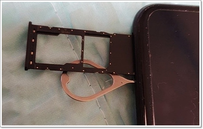 슬롯의 위치를 찾으셨나요? 그렇다면 이제 전용 핀을 이용해, 방금 찾은 작은 구멍에 핀을 꽂아주세요. 핀을 그림에서 보이는 것처럼 수직으로 깊숙이 눌러주시면 됩니다. 그렇게 하면 유심칩이 들어 있는 트레이가 ‘톡’ 하고 밖으로 튀어나오게 됩니다. 이때 너무 세게 누르지 말고, 천천히 밀어 넣는 것이 좋습니다. 트레이가 살짝 나왔다면 손으로 조심히 잡아당겨 꺼내주세요.