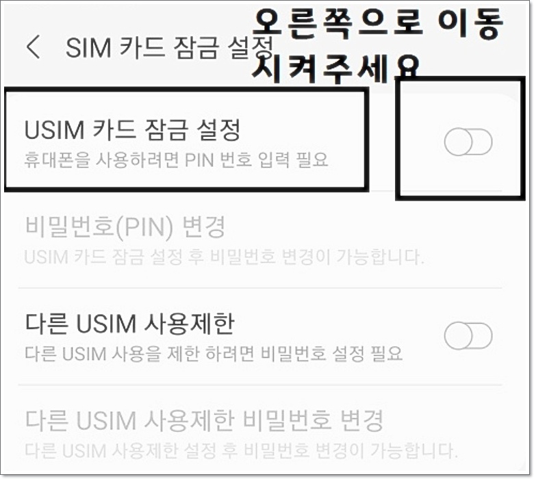 SIM 카드 잠금 설정 화면이 열리면, ‘USIM 카드 잠금 설정’ 오른쪽에 있는 스위치를 오른쪽으로 밀어 활성화시켜 주세요.