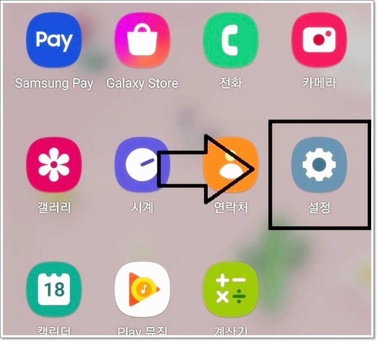 먼저 스마트폰을 켜주세요. 홈 화면에서 앱 아이콘들이 모여 있는 메뉴로 들어가 주세요. 그 안에서 톱니바퀴 모양의 ‘설정’ 아이콘을 찾아 클릭해주세요.