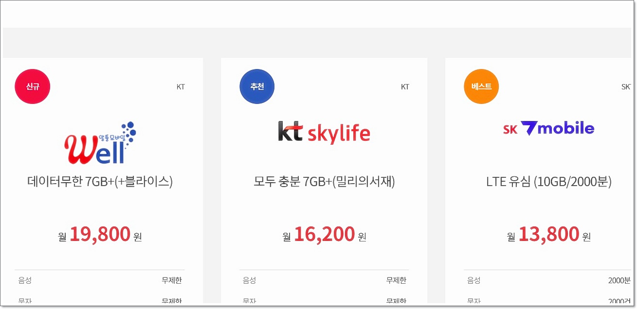 - 예: “월 12,100원 / 데이터 5GB / 통화 무제한 / LGU+ 망 / 유심비 무료”