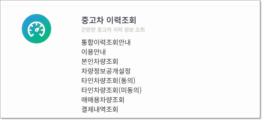 조회 결과로 차량의 등록 정보(차종, 연식, 색상, 소유자 현황 등), 검사 유효기간, 보험 가입 여부, 사고 이력 등 다양한 정보를 확인할 수 있습니다.