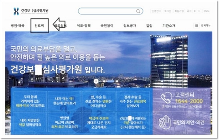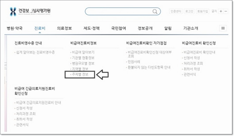 ✅ 2단계: 진료비 정보 클릭 홈페이지에 들어가면 상단 메뉴 중 ‘진료비’ 항목을 클릭합니다. 그다음 ‘주제별 정보’ 항목을 선택해 주세요.