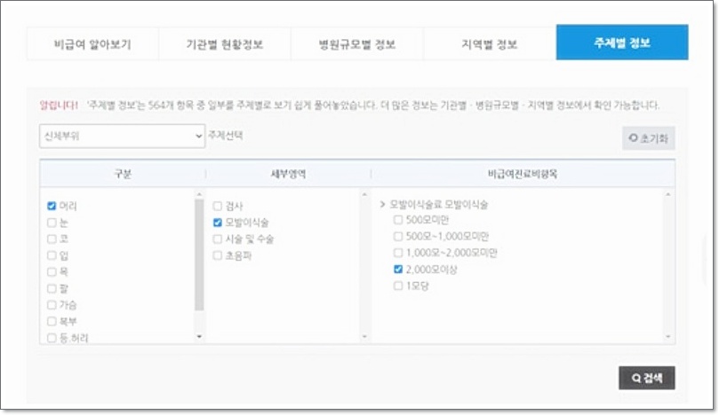 ✅ 3단계: 주제 및 신체부위 선택 ‘주제별 정보’ 페이지가 열리면 먼저 ‘주제 선택’을 클릭하고, 이어서 ‘신체 부위’에서 ‘머리’를 선택합니다.