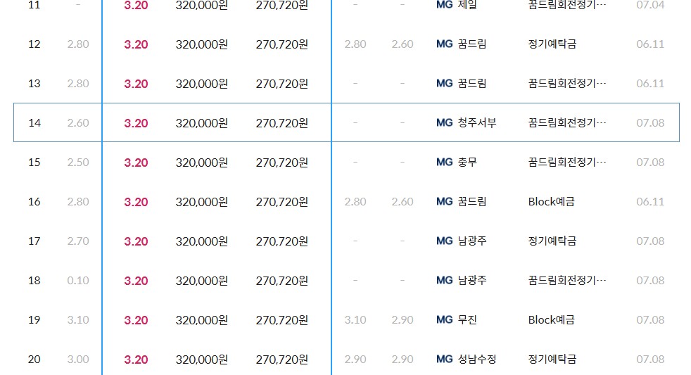 그리고 11위부터 20위까지 알아보려고 하는데요. 금리는 대개 1년 기준 3.2% 대입니다. 새마을금고 지점은 제일, 꿈드림 청주서부,충무, 남광주 등등이며 업데이트 기준은 7월 08일입니다. 대개 다른은행들을 보시게 되면 예금금리는 새마을금고가 높은편이기에 내용들을 보시고 여러분들께서 들어보시기 바라며 이것도 세전과 세후 확인하여 보시고 예금 넣어보시기 바랍니다.