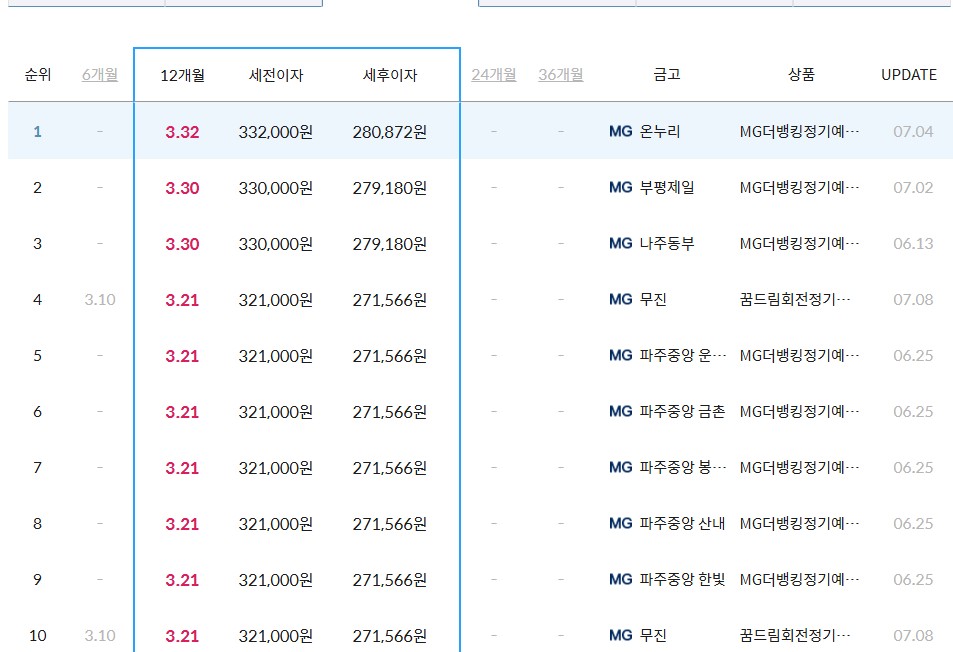 먼저 1위부터 10위까지 알아보려고 하는데요. 1년 예금을 들어놓게 되신다면 최고 3.21~3.32%의 이율을 얻으실수 있습니다. 또한, 세전이자 및 세후이자를 확인하여 보시기 바라며 새마을금고 지점의 경우 온누리, 부평제일, 나주동부, 무진 등등이 이율이 높으며 대개 이율은 비슷비슷하기에 여러분들께서 들어두고 싶으시다면 위의 이율과 더불어 아래의 이율도 같이 보시고 이자율 확인하여 보시면서 지점 확인하실수 있도록 아래의 넣어드릴터이니 같이 확인하여 보시길 바라겠습니다.