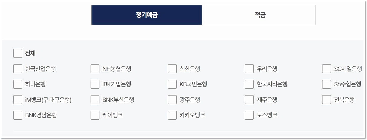 관심 있는 은행의 상품을 클릭하면 세부 조건, 중도해지 이율, 수수료, 가입 방법 등을 확인할 수 있습니다.
