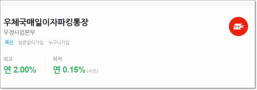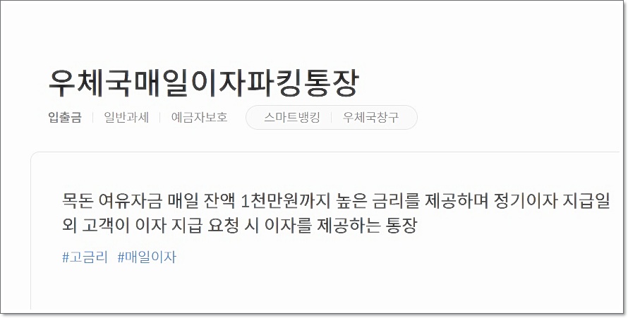 뉴 잡다지식 여러분들 안녕하세요, 오늘은 안정적인 이자 수익을 원하는 분들을 위해 우체국의 ‘매일이자 파킹통장’에 대해 자세히 소개해드리려고 합니다, 매일이자 파킹통장은 계좌에 입금된 돈에 대해 매일 이자가 계산되어 지급되는 특징이 있어, 단기 자금 운용이나 여유 자금을 효율적으로 관리하고 싶은 분들에게 적합합니다, 특히 은행 예금과 비교했을 때 비교적 높은 금리를 제공하며, 자동 입출금이 가능해 자금 유동성이 필요한 분들에게도 유용합니다, 계좌 개설 방법과 금리, 수수료, 입출금 조건 등도 간단히 확인할 수 있어 처음 이용하는 분들도 쉽게 접근할 수 있습니다, 이번 글에서는 매일이자 파킹통장의 특징과 장단점, 활용 방법까지 구체적으로 안내해드리겠습니다, 안정적인 재테크와 효율적인 자금 운용을 위해 관심 있는 분들은 이번 정보를 참고하여 자신에게 맞는 활용법을 찾아보시길 바랍니다.
