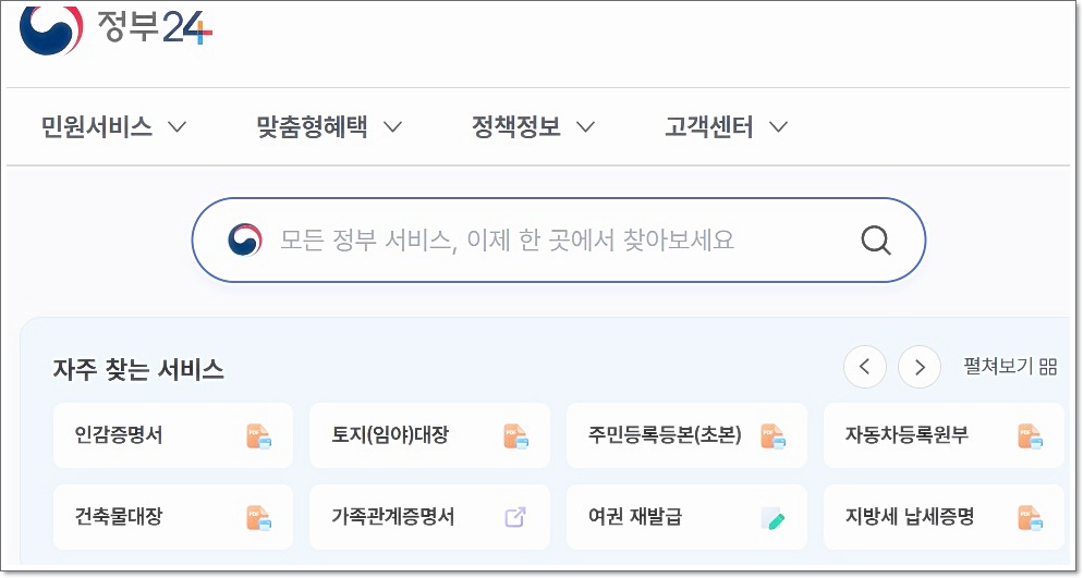 정부24는 정부의 민원 서비스, 정부혜택(보조금24), 정책정보/기관정보 등을 한 곳에서 한 눈에 찾을 수 있고 각 기관의 주요 서비스를 신청·조회·발급할 수 있는 대한민국 정부 대표 포털입니다
